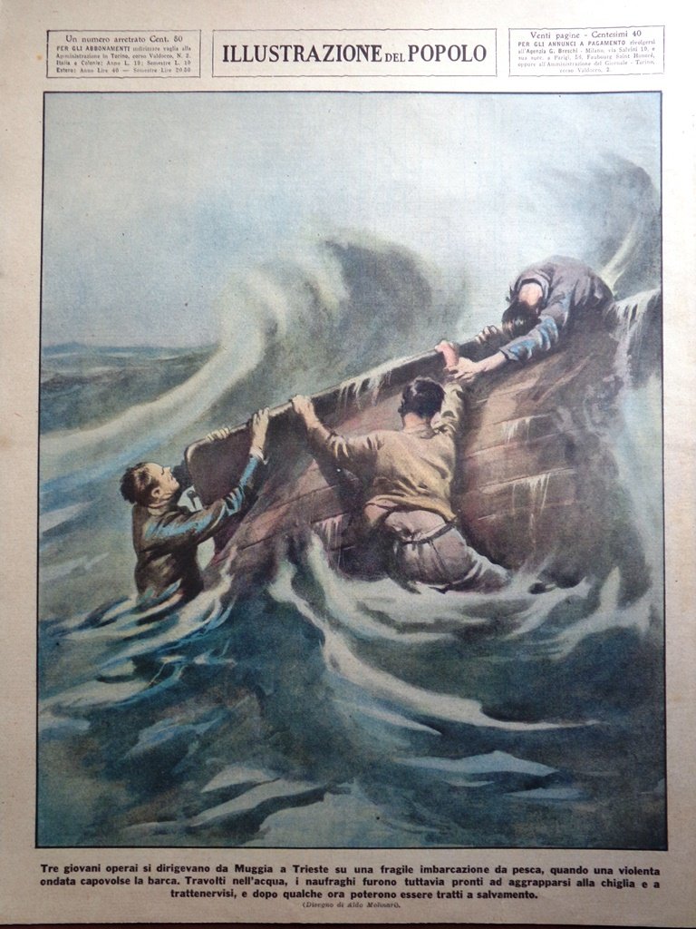 Tre giovani operai si dirigevano da Muggia a Trieste su una fragile imbarcazione da pesca, quando una violenta ondata capovolse la barca. Travolti nell'acqua, i naufraghi furono tuttavia pronti ad aggrapparsi alla chiglia e a trattenervisi, e dopo qualche ora poterono essere tratti a salvamento (Aldo Molinari)