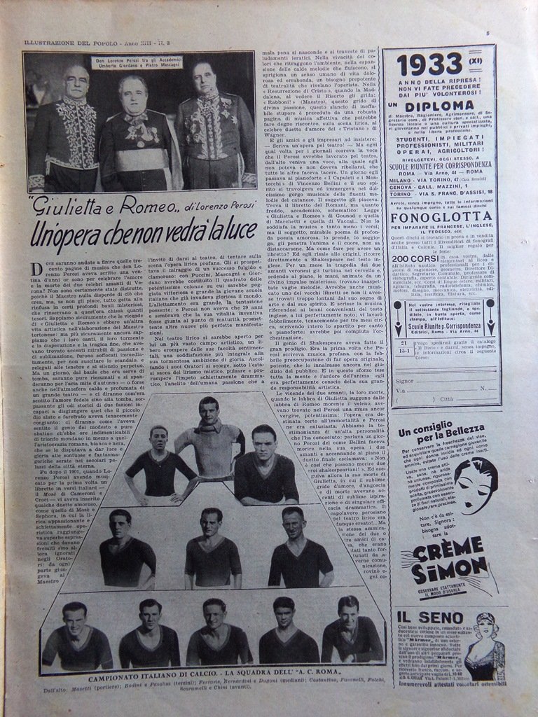 Illustrazione del Popolo 15 Gennaio 1933 Roma Calcio AC Perosi Petrolio Crawford