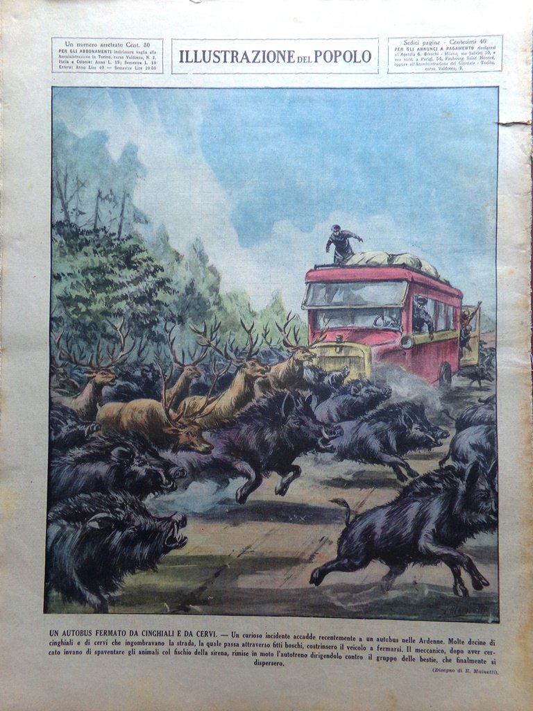 Un autobus fermato da cinghiali e da cervi: un curioso incidente accadde recentemente a un autobus nelle Ardenne. Molte decine di cinghiali e di cervi che ingombravano la strada, la quale passa attraverso fitti boschi, costrinsero il veicolo a fermarsi. Il meccanico, dopo aver cercato invano di spaventare gli animali col fischio della sirena, rimise in modo l'autotreno dirigendolo contro il gruppo delle bestie, che finalmente si dispersero (E. Mainetti)