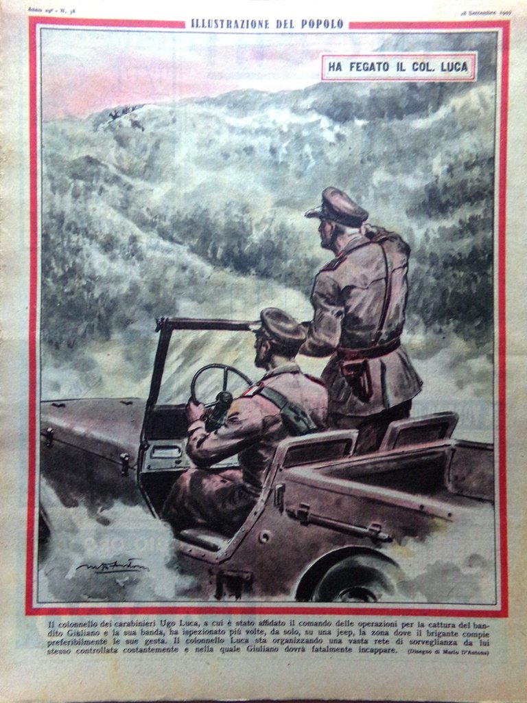 Il colonnello dei carabinieri Ugo Luca, a cui è stato affidato il comando delle operazioni per la cattura del bandito Giuliano e la sua banda, ha ispezionato più volte, da solo, su una jeep, la zona dove il brigante compie preferibilmente le sue gesta. Il colonnello Luca sta organizzando una vasta rete di sorveglianza da lui stesso controllata costantemente e nella quale Giuliano dovrà fatalmente incappare (Mario D'Antona)