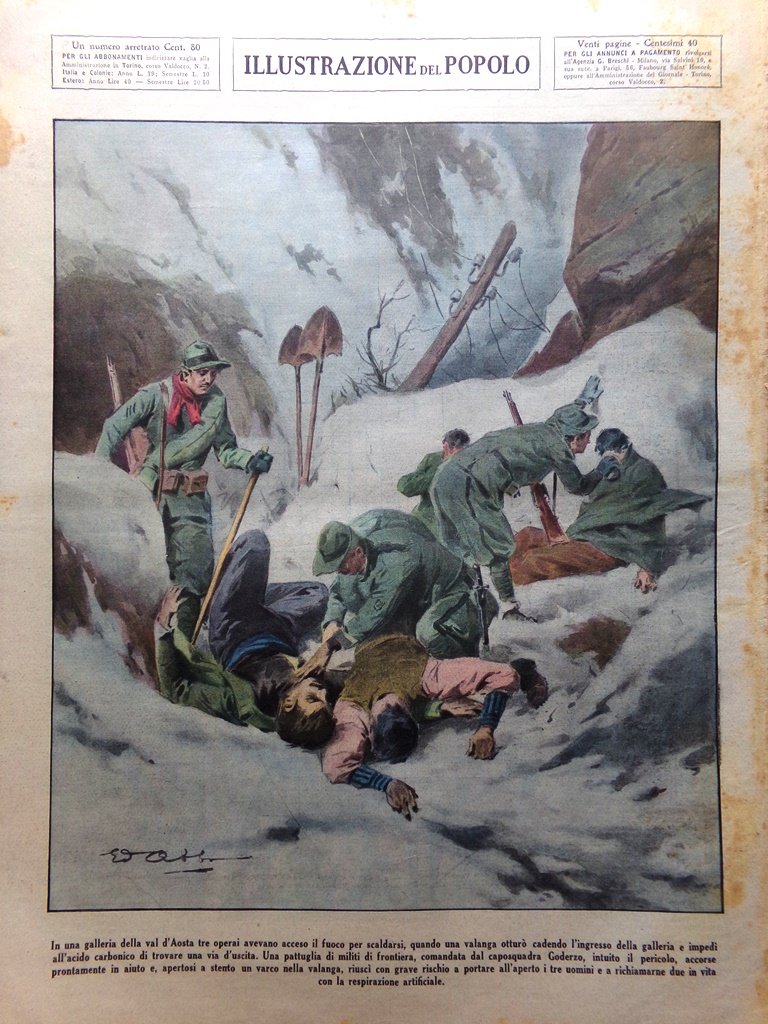 In una galleria della Val d'Aosta tre operai avevano acceso il fuoco per scaldarsi, quando una valanga otturò cadendo l'ingersso della galleria e impedì all'acido carbonico di trovare una via d'uscita. Una pattuglia di militi di frontiera, comandata dal caposquadra Goderzo, intuito il perico, accorse prontamente in aiuto e, apertosi a stento un varco nella valanga, riuscì con grave rischio a portare all'aperto i tre uomini e a richiamarne due in vita con la respirazione artificiale