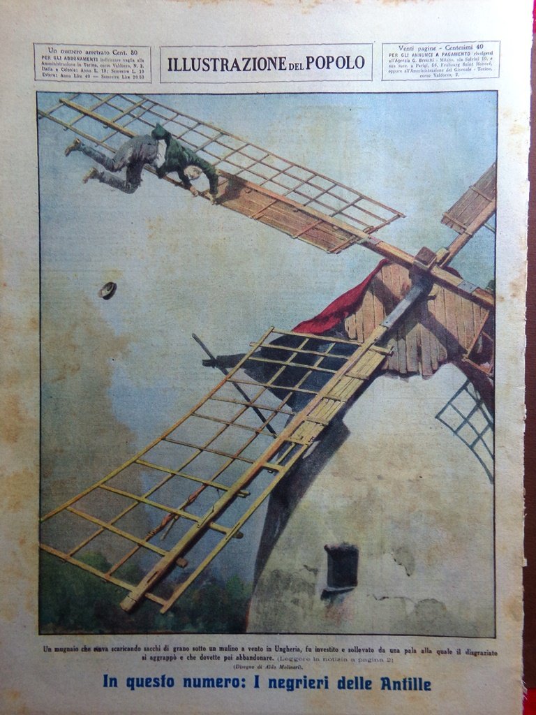 Un mugnaio che stava scaricando sacchi di grano sotto un mulino a vento in Ungheria, fu investito e sollevato da una pala alla quale il disgraziato si aggrappò e che dovette poi abbandonare (Aldo Molinari)