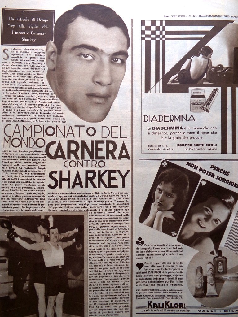 Illustrazione del Popolo 2 Luglio 1933 Cani Carnera Sharkey Bologna Gambe Rose