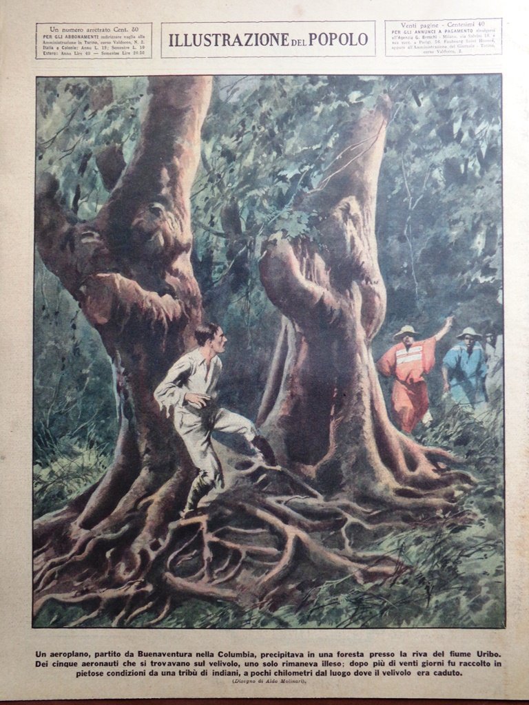 Un aeroplano, partito da Buenaventura nella Columbia, precipitava in una foresta presso la riva del fiume Uribo. Dei cinque aeronauti che si trovavano sul velivolo, uno solo rimaneva illeso, dopo più di venti giorni fu raccolto in pietose condizioni da una tribù di indiani, a pochi chilometri dal luogo dove il velivolo era caduto (Aldo Molinari)