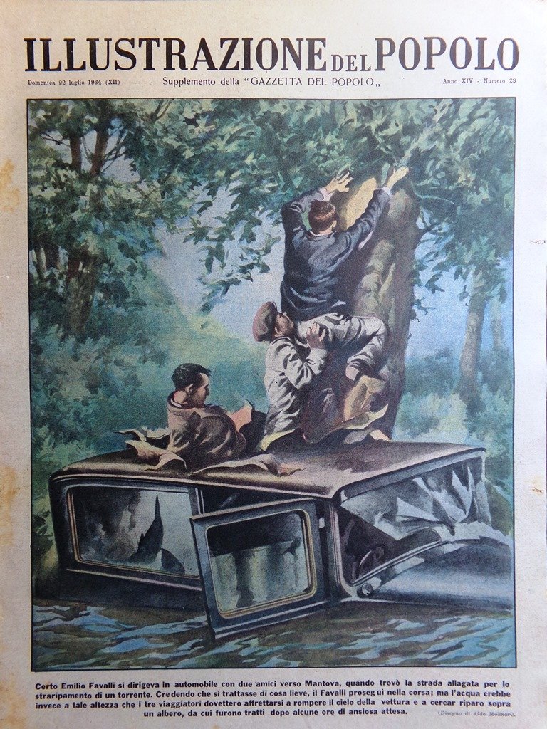 Certo Emilio Favalli si dirigeva in automobile con due amici verso Mantova, quando trovò la strada allagata per lo straripamento di un torrente. Credendo che si trattasse di cosa lieve, il Favalli proseguì nella corsa; ma l'acqua crebbe invece a tale altezza che i tre viaggiatori dovettero affrettarsi a rompere il cielo della vettura e a cercar riparo sopra un albero da cui furono tratti dopo ore di ansiosa attesa (Aldo Molinari)