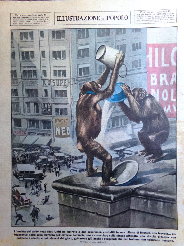 L'ondata del caldo negli Stati Uniti ha ispirato a due scimmioni, custoditi in una clinica di Detroit, una trovata. refrigerante: saliti sulla terrazza dell'edificio, cominciarono a rovesciare sulla strada affollata una doccia d'acqua con catinelle e secchi, e poi, stanchi del gioco, gettarono giù anche i recipienti che per fortuna non colpirono nessuno (Aldo Molinari)