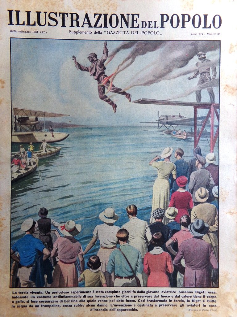 La torcia vivente. Un pericoloso esperimento è stato compiuto giorni fa dalla giovane aviatrice Susanna Biget: essa, indossato un costume antiinfiammabile di sua invenzione che oltre a preservare dal fuoco e dal calore tiene il corpo a galla, si fece cospargere di benzina alla quale venne poi dato fuoco. Così trasformata in torcia, la Biget si buttò in acqua da un trampolino, senza subire alcun danno. L'invenzione è destinata a preservare gli aviatori in caso d'incendio dell'apparecchio (Carlo Nicco)