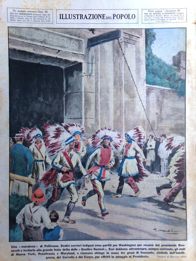 Una "maratona" di Pellirosse. Dodici corrieri indigeni sono partiti per Washington per recarsi dal presidente Roosevelt e invitarlo alla grande festa detta delle "Quattro Nazioni". Essi debbono attraversare, sempre correndo, gli stati di New York, Pensilvania e Maryland, e ciascuno stringe in mano tre grani di frumento, simbolo dell'Intelligenza, del Cervello e del Corpo, per offrirli in omaggio al presidente (Edmondo Abbo)
