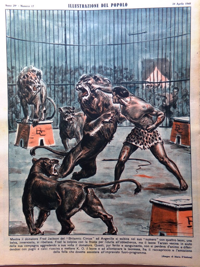 Mentre il domatore Fred Jackson del "Britannic Circus" ad Angeville si esibiva nel suo "numero" con quattro leoni, una belva, innervosita si ribellava. Fred la colpiva con la frusta per ridurla all'obbedienza, ma il leone Tarzan veniva in aiuto della sua compagna aggredendo a sua volta il domatore. Questi, pur ferito e sanguinante, non si perdeva d'animo e difendendosi con calci e pugni riusciva a mettere KO il leone e ad allontanare la leonessa, fra il raccapriccio e l'emozione della folla che dovette assistere all'imprevisto fuori programma (Mario D'Antona)