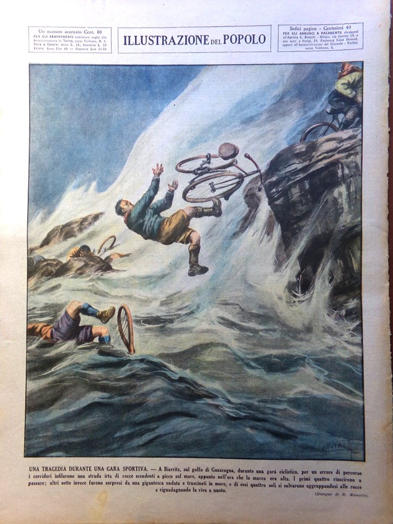 Una tragedia durante una gara sportiva: a Biarritz, sul golfo di Guascogna, durante una gara ciclistica, per un errore di percorso i corridori infilarono una strada irta di rocce scendenti a picco sul mare, appunto nell'ora che la marea era alta. I primi quattro riuscirono a passare; altri sette invece furono sorpresi da una gigantesca ondata e trascinati in mare, e di essi quattro soli si salvarono aggrappandosi alle rocce e riguadagnando la riva a nuoto (E. Mainetti)