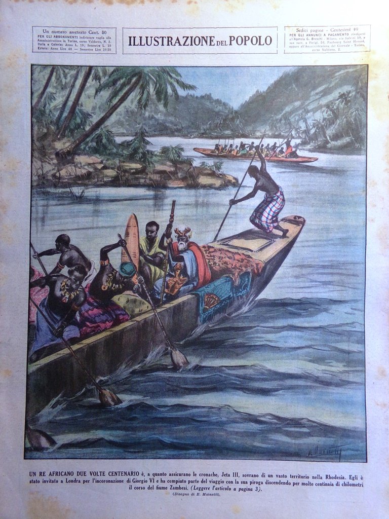 Un re africano due volte centenario è, a quanto assicurano le cronache, Jeta III, sovrano di un vasto territorio della Rhodesia. Egli è stato invitato a Londra per l'incoronazione di Giorgio VI e ha compiuto parte del viaggio con la sua piroga discendendo per molte centinaia di chilometri il corso del fiume Zambesi (E. Mainetti)