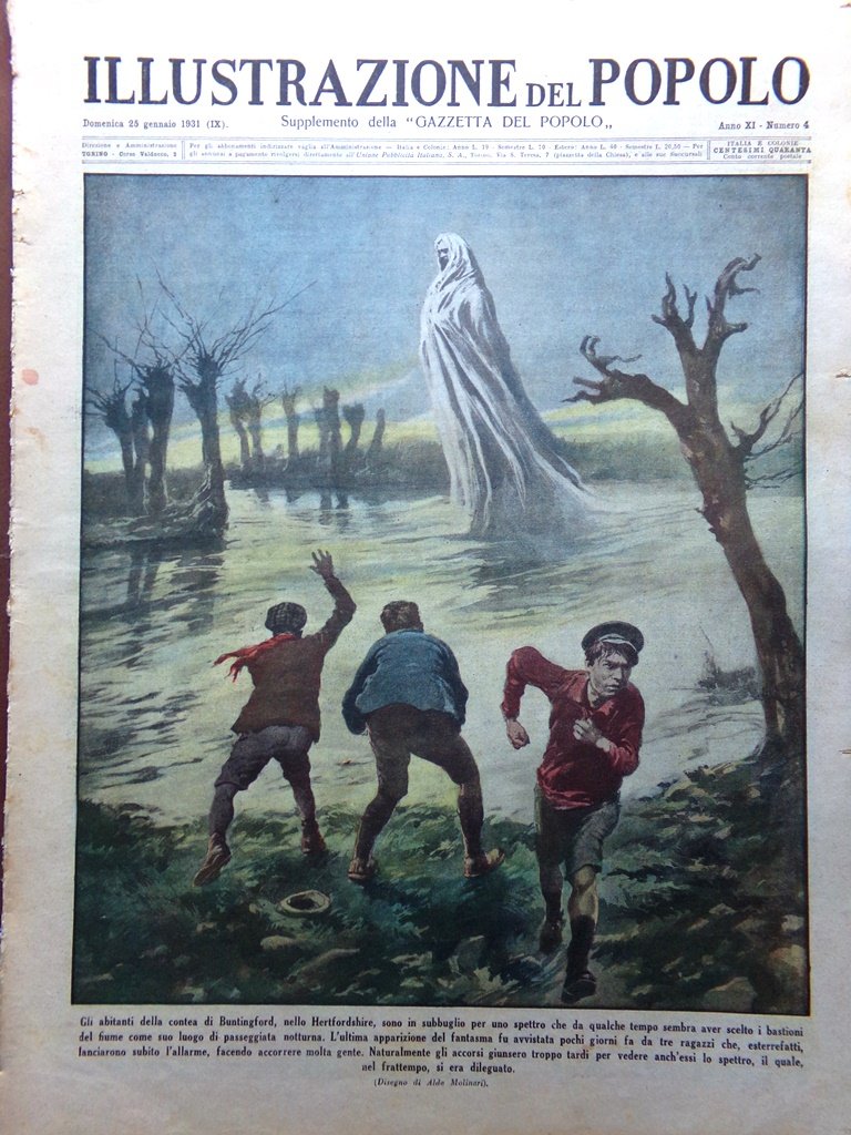 Gli abitanti della contea di Buntingford, nello Heartfordshire, sono in subbuglio per uno spettro che da qualche tempo sembra aver scelto i bastioni del fiume come suo luogo di passeggiata notturna. L'ultima apparizione del fantasma fu avvistata pochi giorni fa da tre ragazzi che, esterrefatti, lanciarono subito l'allarme, facendo accorrere molta gente. Naturalmente gli accorsi giunsero troppo tardi per vedere anch'essi lo spettro, il quale, nel frattempo, si era dileguato (Aldo Molinari)