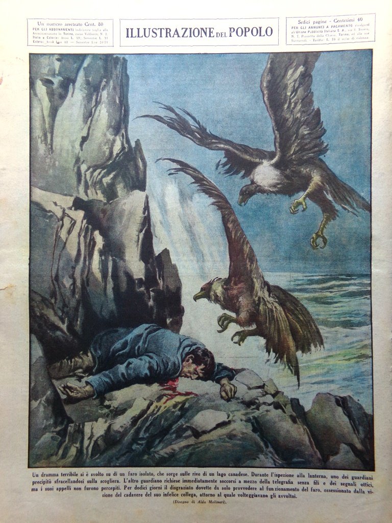 Un dramma terribile si è svolto su di un faro isolato, che sorge sulle rive di un lago canadese. Durante l'ispezione alla lanterna, uno dei guardiani precipitò sfracellandosi sulla scogliera. L'altro guardiano richiese immediatamente soccorsi a mezzo della telegrafia senza fili e dei segnali ottici, ma i suoi appelli non furono percepiti. Per dodici giorni il disgraziato dovette da solo provvedere al funzionamento del faro, ossessionato dalla visione del cadavere del suo infelice collega, attorno al quale volteggiavano gli avvoltoi (Aldo Molinari)
