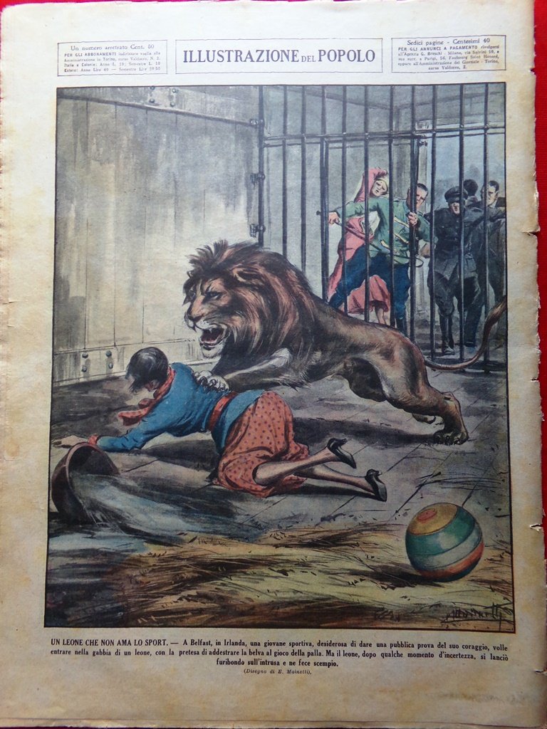 Un leone che non ama lo sport: a Belfast, in Irlanda, una giovane sportiva, desiderosa di dare una pubblica prova del suo coraggio, volle entrare nella gabbia di un leone, con la pretesa di addestrare la belva al gioco della palla. Ma il leone, dopo qualche momento d'incertezza, si lanciò furibondo sull'intrusa e ne fece scempio (E. Mainetti)