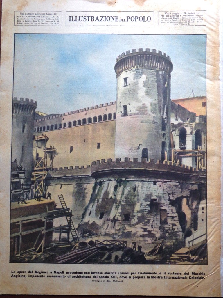 Le opere del Regime: a Napoli procedono con intensa alacrità i lavori per l'isolamento e il restauro del Maschio Angioino, imponente monumento di architettura del secolo XIII, dove si prepara la Mostra Internazionale Coloniale (Aldo Molinari)