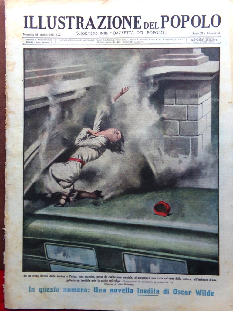 Su un treno diretto dalla Lorena a Parigi, una maestra, presa da esaltazione mentale, si arrampicò non vista sul tetto della vettura: all'imbocco di una galleria un terribile urto la uccise sul colpo (Aldo Molinari)