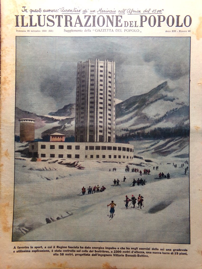 A favorire lo sport, a cui il Regime fascista ha dato energico impulso e che ha negli esercizi dello sci una gradevole e utilissima esplicazione, è stata costruita sul colle del Sestrières a 2300 metri d'altezza, una nuova torre di 19 piani alta 58 metri, progettata dall'ingegnere Vittorio Bonadè-Bottino