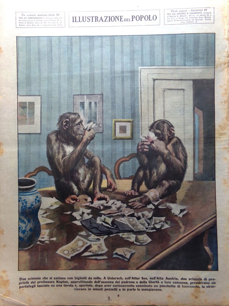 Due scimmie che si saziano con biglietti da mille. A Unterach, sull'Atter See, nell'Alta Autria, due scimmie di proprietà del professore Kaplan, approfittando dell'assenza del padrone e della libertà a loro concessa, prendevano un portafogli lasciato su una tavola e, apertolo, dopo aver curiosamente esaminato un pacchetto di banconote, le stracciavano in minuti pezzetti e in parte le mangiavano