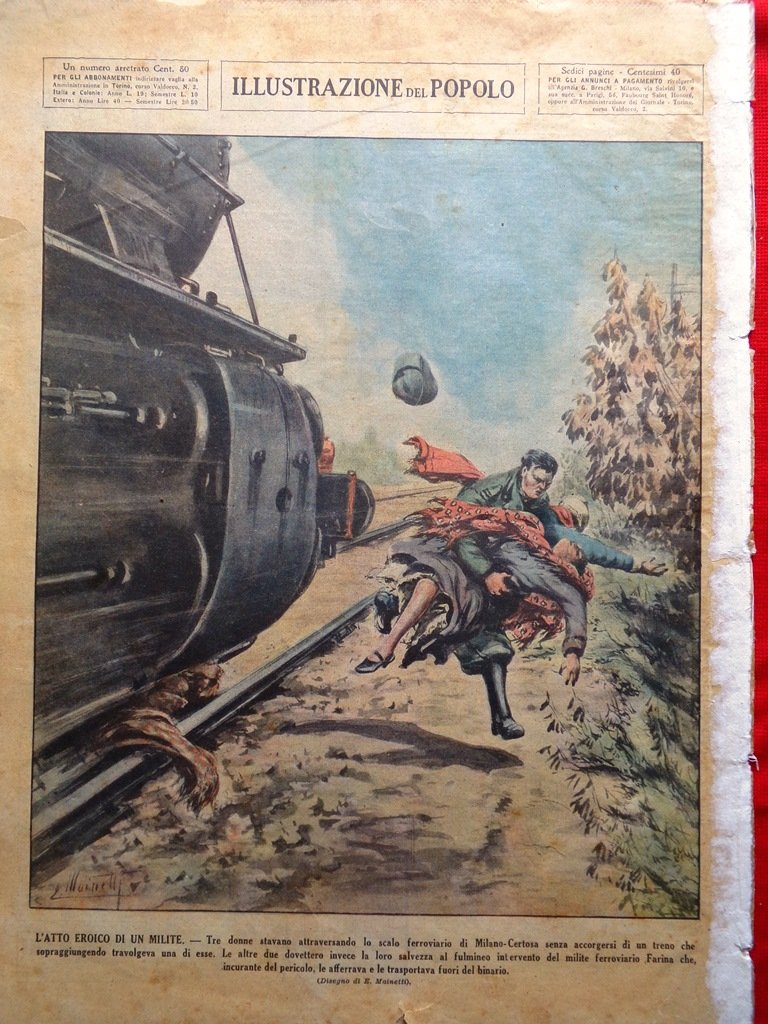 L'atto eroico di un milite - tre donne stavano attraversando lo scalo ferroviario di Milano-Certosa senza accorgersi di un treno che sopraggiungendo travolgeva una di esse. Le altre due dovettero invece la loro salvezza al fulmineo intervento del milite ferroviario Farina che, incurante del pericolo, le afferrava e le trasportava fuori del binario (E. Mainetti)