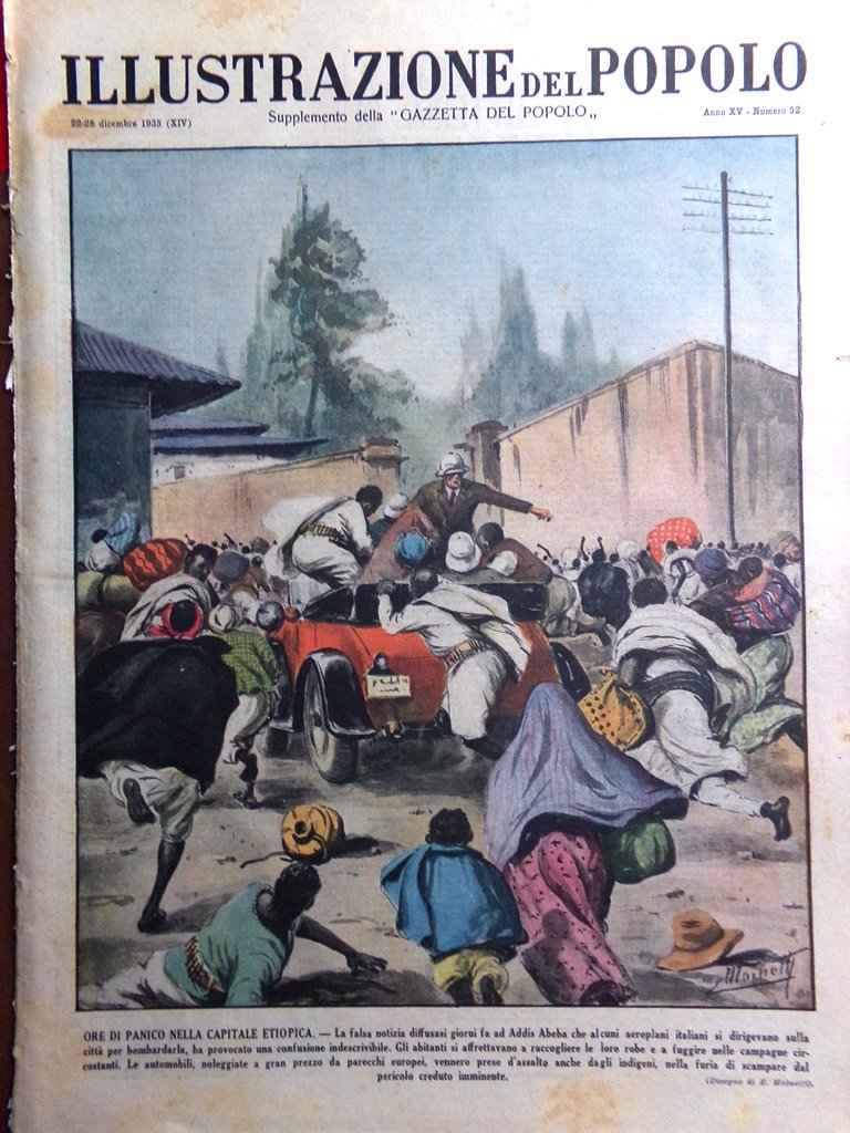 La falsa notizia diffusasi giorni fa ad Addis Abeba che alcuni aeroplani italiani si dirigevano sulla città per bombardarla, ha provocato una confusione indescrivibile. Gli abitanti si affrettavano a raccogliere le loro robe e a fuggire nelle campagne circostanti. Le automobili, noleggiate a gran prezzo da parecchi europei, vennero prese d'assalto anche dagli indigeni, nella furia di scampare dal pericolo creduto imminente (E. Mainetti)
