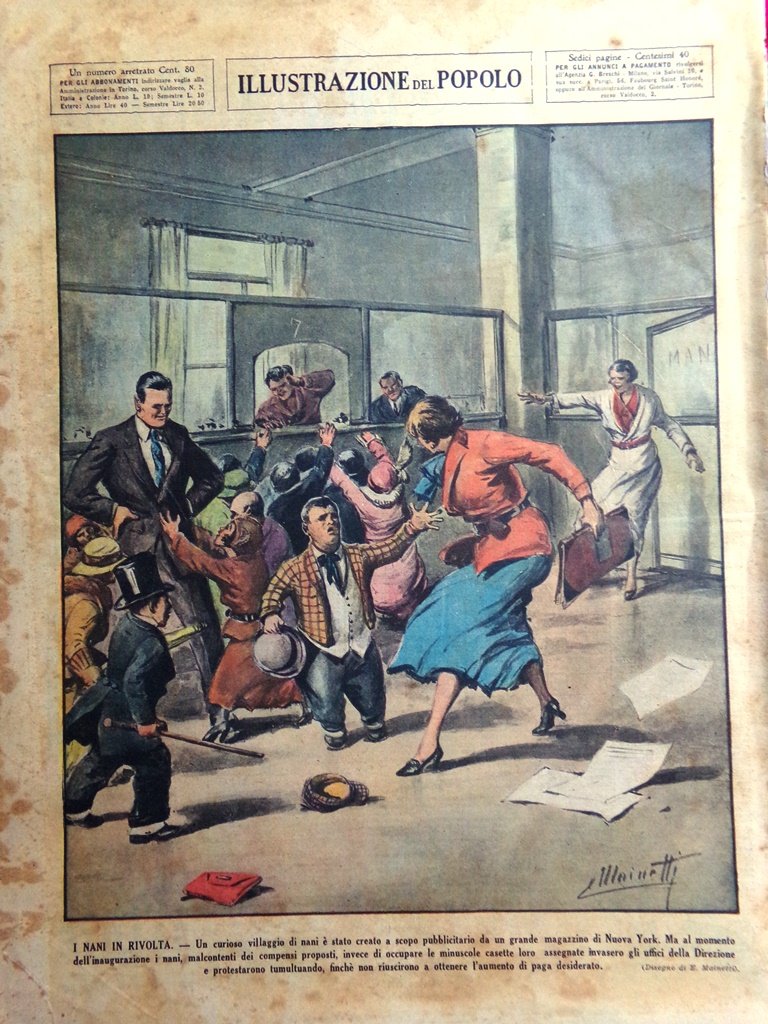 Un curioso villaggio di nani è stato creato a scopo pubblicitario da un grande magazzino di New York. Ma al momento dell'inaugurazione i nani, malcontenti dei compensi proposti invece di occupare le minuscole casette loro assegnate, invasero gli uffici della Direzione e protestarono tumultuando, finché non riuscirono ad ottenere l'aumento di paga desiderato (E. Mainetti)