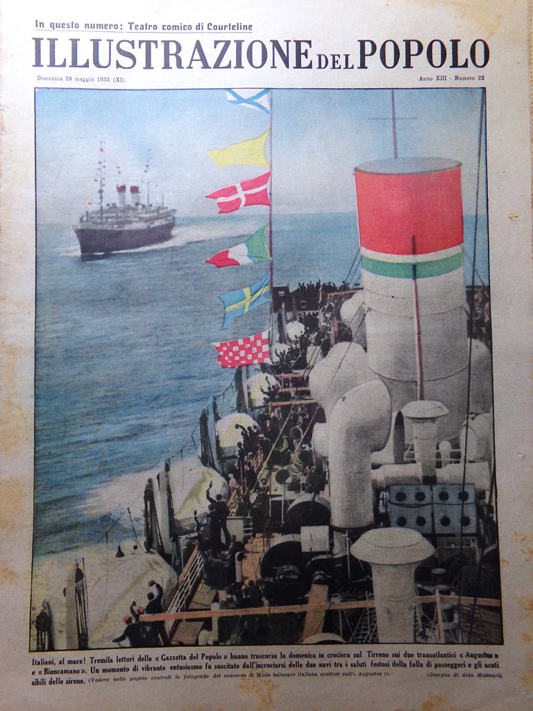 Italiani, al mare! Tremila lettori della "Gazzetta del Popolo" hanno trascorso la domenica in crociera sul Tirreno sui due transatlantici "Augustus" e "Biancamano". Un momento di vibrante entusiasmo fu suscitato dall'incrociarsi delle due navi tra i saluti festosi della folla di passeggeri e gli acuti sibili delle sirene (Aldo Molinari)
