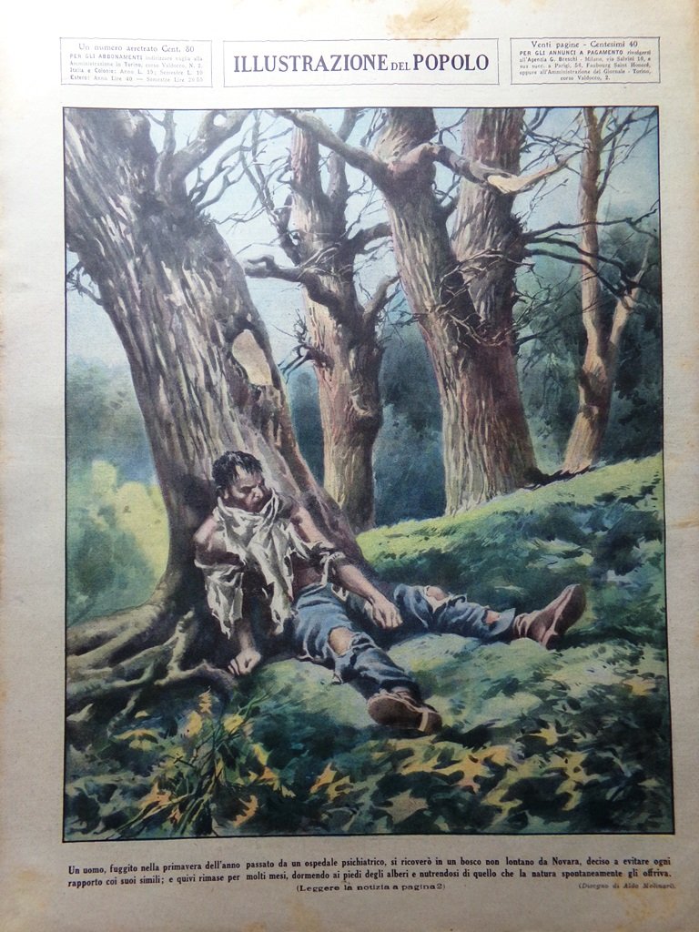 Un uomo, fuggito nella primavera dell'anno passato da un ospedale psichiatrico, si ricoverò in un bosco non lontano da Novara, deciso a evitare ogni rapporto coi suoi simili; e quivi rimase per molti mesi, dormendo ai piedi degli alberi e nutrendosi di quello che la natura spontaneamente gli offriva (Aldo Molinari)