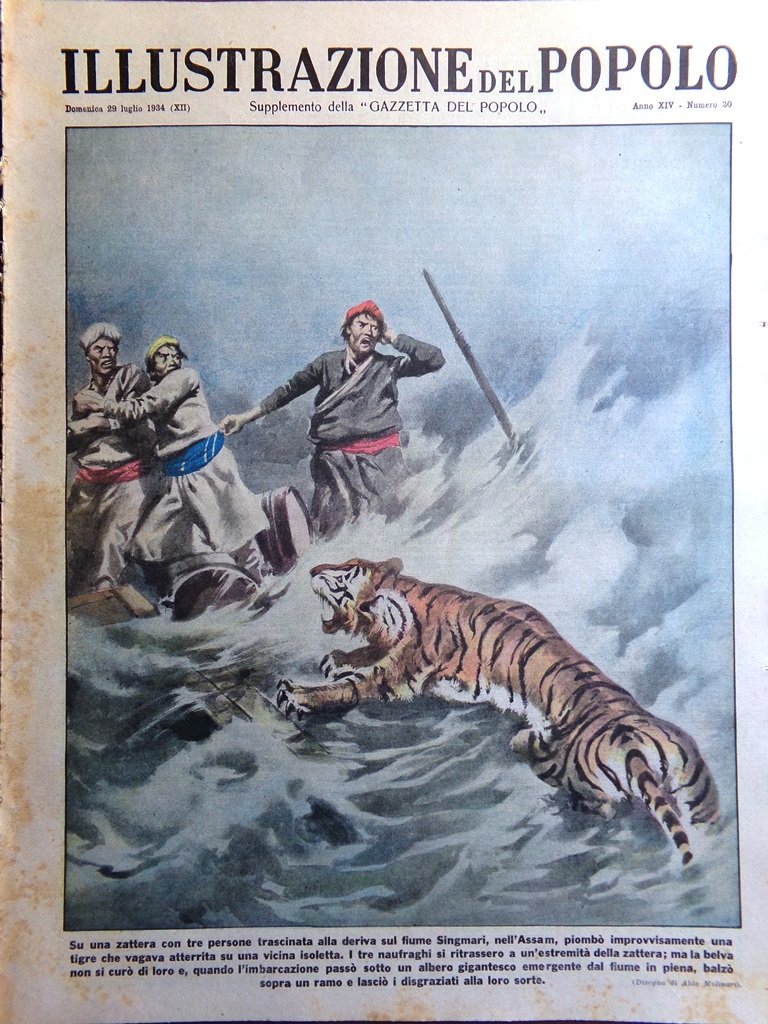 Su una zattera con tre persone trascinata alla deriva sul fiume Singmari, nell'Assam, piombò improvvisamente una tigre che vagava atterrita su una vicina isoletta. I tre naufraghi si ritrassero a un'estremità della zattera; ma la belva non si curò di loro e, quando l'imbarcazione passò sotto un albero gigantesco emergente dal fiume in piena, balzò sopra un ramo e lasciò i disgraziati alla loro sorte (Aldo Molinari)