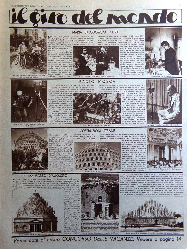Giro del mondo: la morte di Marie Sklodowska Curie, Radio Mosca, il Mausoleo d'Augusto