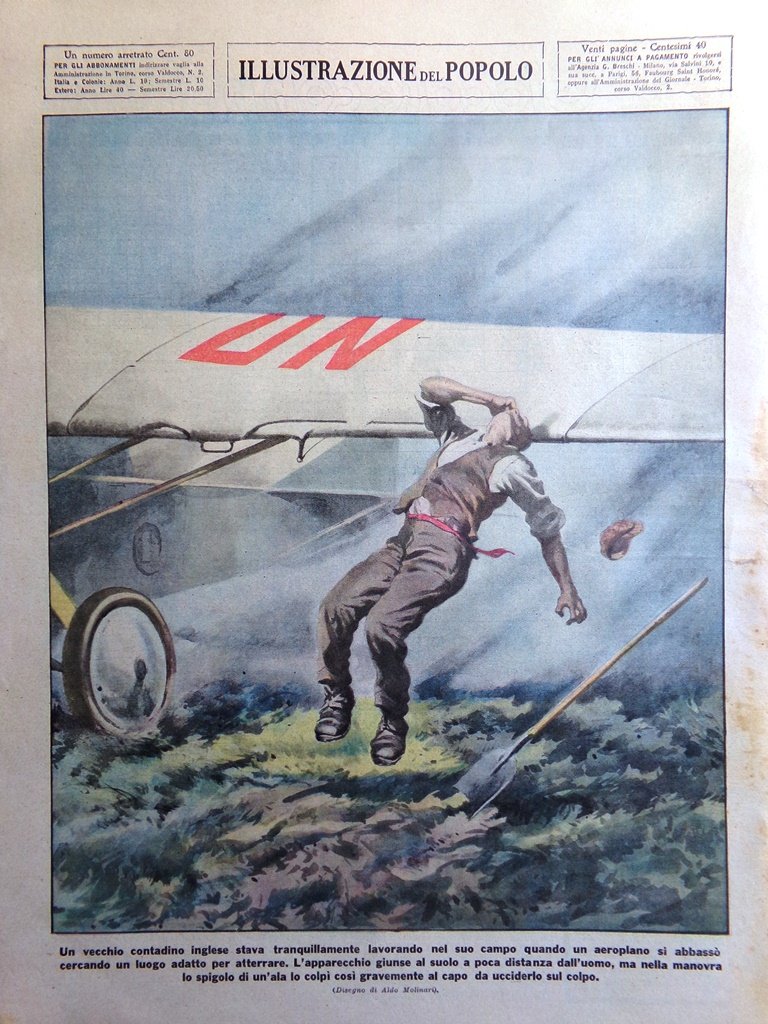 Un vecchio contadino inglese stava tranquillamente lavorando nel suo campo quando un aeroplano si abbassò cercando un luogo adatto per atterrare. L'apparecchio giunse al suolo a poca distanza dall'uomo, ma nella manovra lo spigolo di un'ala lo colpì così gravemente al capo da ucciderlo sul colpo (Aldo Molinari)