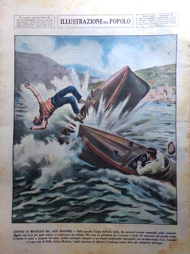 Nello specchio d'acqua dell'isola Ghiffa, due motoscafi stavano compiendo ardite evoluzioni quando, non si sa per quale motivo, si scontravano con violenza. Nel cozzo un giovanotto che si trovava a bordo del motoscafo più piccolo veniva proiettato in acqua e, inesperto del nuoto, sarebbe certamente annegato se non fossero prontamente sopraggiunti con un'imbarcazione l'avv. Gonzales e il capo scalo di Ghiffa, Andrea Marforio, i quali riuscivano ad afferrare il naufrago mentre stava per scomparire sott'acqua
