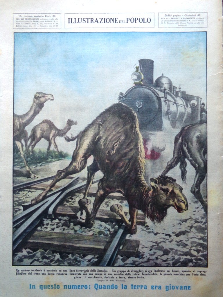 Un curioso incidente è accaduto su una linea ferroviaria della Somalia. Un gruppo di dromedari si era inoltrato sui binari, quando al sopraggiungere del treno una bestia rimaneva incastrata con una zampa in uno scambio delle rotaie. Investendola, la piccola macchina per l'urto deragliava: il macchinista, sbalzato a terra, rimase ferito (Aldo Molinari)