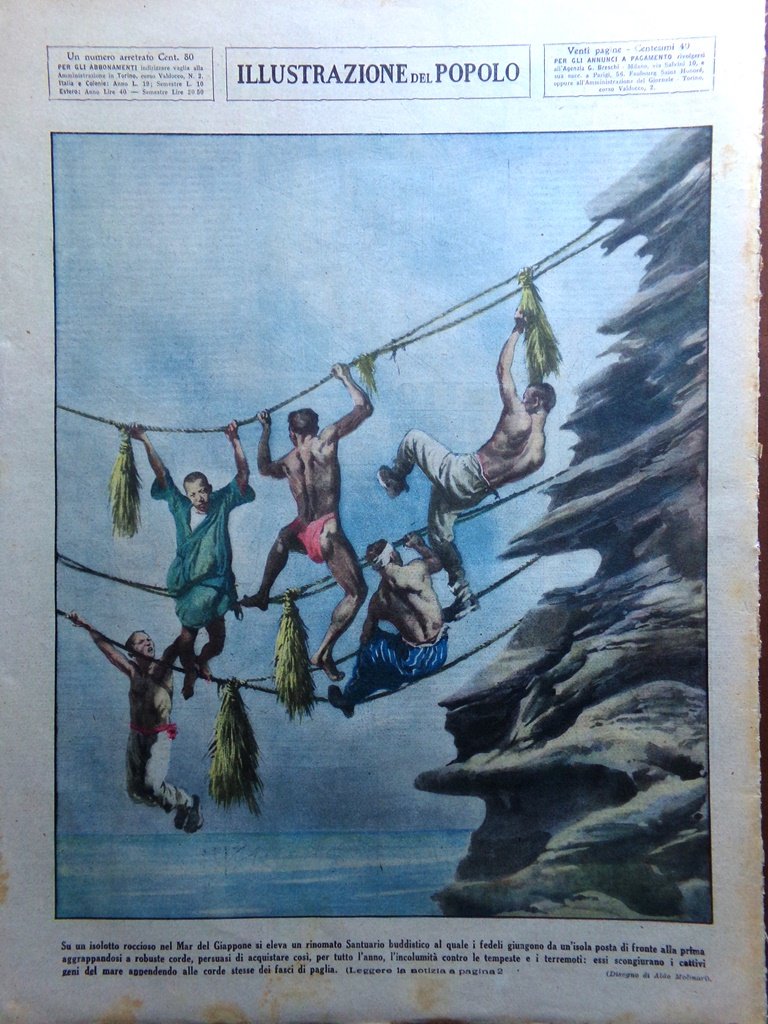 Su un isolotto roccioso nel Mar del Giappone si eleva un rinomato Santuario buddistico al quale i fedeli giungono da un'isola posta di fronte alla prima aggrappandosi a robuste corde, persuasi di acquistare così, per tutto l'anno, l'incolumità contro le tempeste e i terremoti: essi scongiurano i cattivi geni del mare appendendo alle corde stesse dei fasci di paglia (Aldo Molinari)