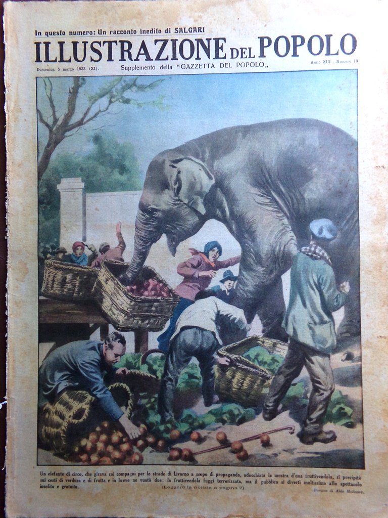 Un elefante di circo, che girava coi compagni per le strade di Livorno a scopo di propaganda, adocchiata la mostra di una fruttivendola, si precipitò sui cesti di verdura e di frutta e in breve ne vuotò due: la fruttivendola fuggì terrorizzata, ma il pubblico si divertì moltissimo allo spettacolo insolito e gratuito (Aldo Molinari)