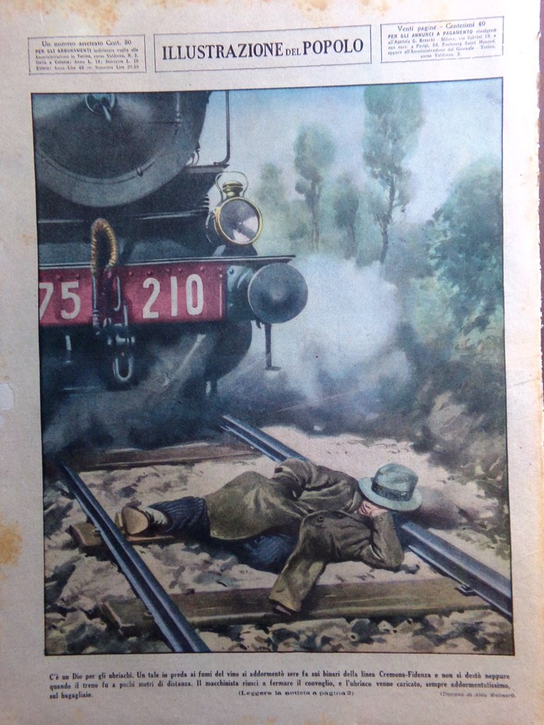 C'è un Dio per gli ubriachi. Un tale in preda ai fumi del vino si addormentò sere fa sui binari della linea Cremona-Fidenza e non si destò neppure quando il treno fu a pochi metri di distanza. Il macchinista riuscì a fermare il convoglio, e l'ubriaco venne caricato, sempre addormentatissimo sul bagagliaio (Aldo Molinari)