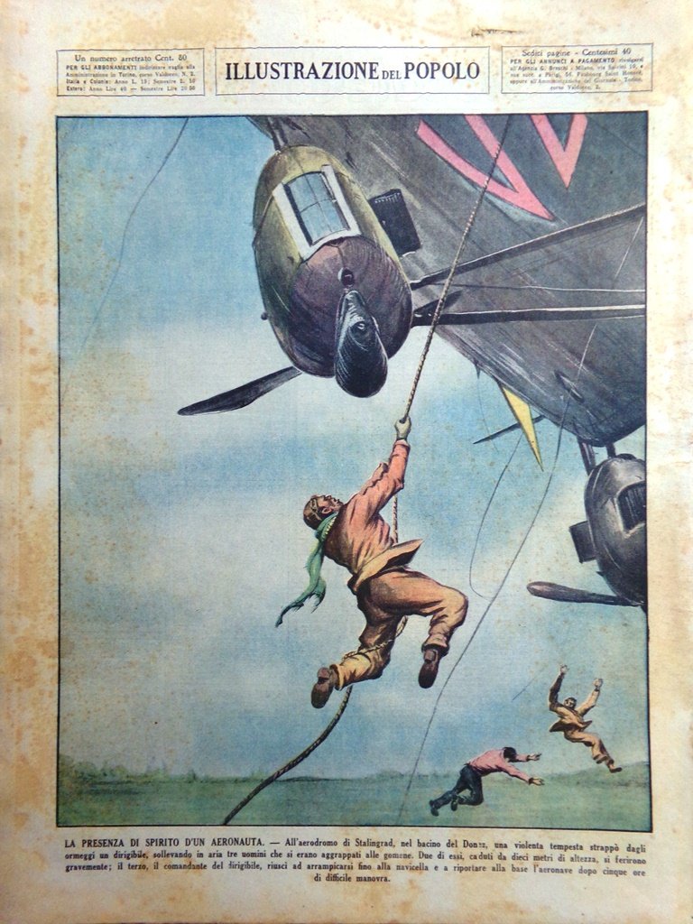 All'aerodromo di Stalingrad, nel bacino del Donez, una violenta tempesta strappò dagli ormeggi un dirigibile, sollevando in aria tre uomini che si erano aggrappati alle gomene. Due di essi, caduti da dieci metri di altezza, si ferirono gravemente; il terzo, il comandante del dirigibile, riuscì ad arrampicarsi fino alla navicella e a riportare alla base l'aeronave dopo cinque ore di difficile manovra