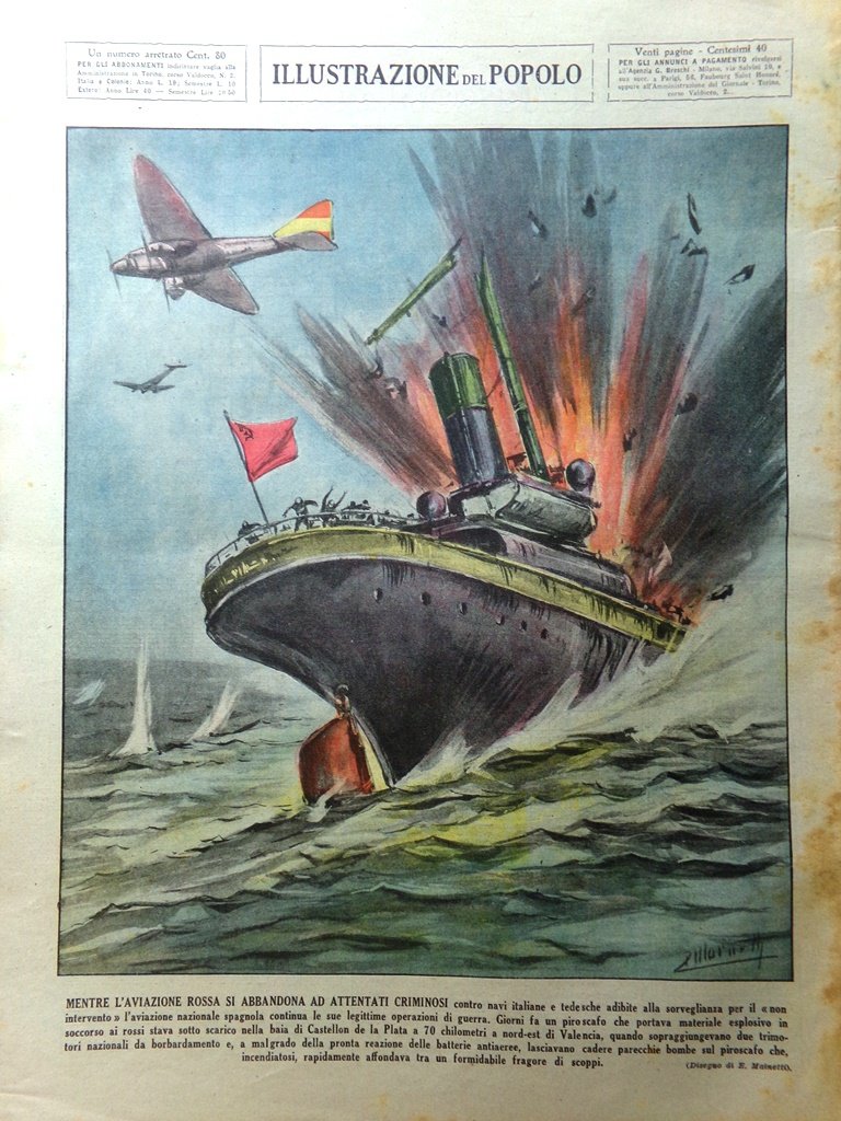 Mentre l'aviazione rossa si abbandona ad attentati criminosi contro navi italiani e tedesche adibite alla sorveglianza per il "non intervento" l'aviazione nazionale spagnola continua le sue legittime operazioni di guerra. Giorni fa un piroscafo che portava materiale esplosivo in soccorso ai rossi stava sotto scarico nella baia di Castellon de la Plata a 70 chilometri a nord-est di Valencia, quando sopraggiungevano due trimotori nazionali da bombardamento e, a malgrado della propria reazione delle batterie antiaeree, lasciavano cadere parecchie bombe sul piroscafo che, incendiatosi, rapidamente affondava tra un formidabile fragore di scoppi (E. Mainetti)