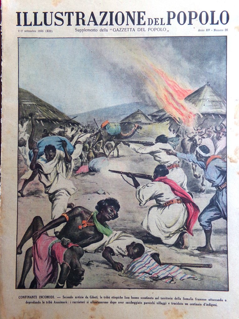 Secondo notizie da Gibuti le tribù etiopiche Issa hanno sconfinato nel territorio della Somalia francese attaccando e depredando le tribù Assaimarà: i razziatori si allontanarono dopo aver saccheggiato parecchi villaggi e trucidato un centinaio di indigeni (B. Ingegnoli)