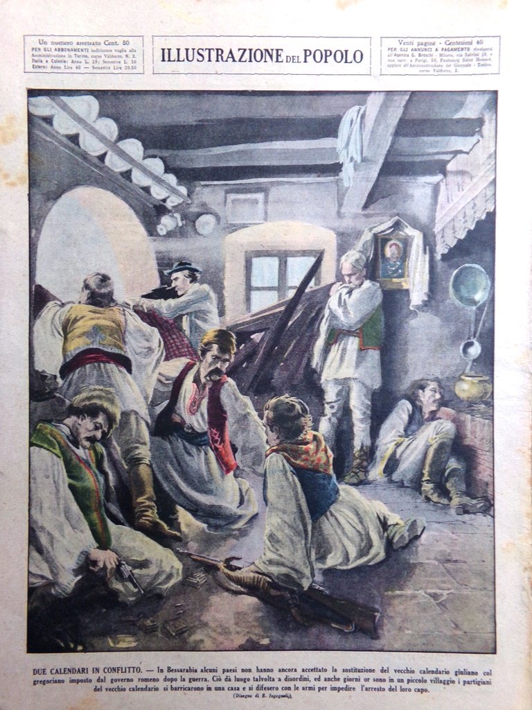 In Bessarabia alcuni paesi non hanno ancora accettato la sostituzione del vecchio calendario giuliano col gregoriano imposto dal governo romeno dopo la guerra. Ciò dà luogo talvota a disordini, ed anche giorni or sono in un piccolo villaggio i partigiani del vecchio calendario si barricarono in una casa e si difesero con le armi per impedire l'arresto del loro capo (B. Ingegnoli)