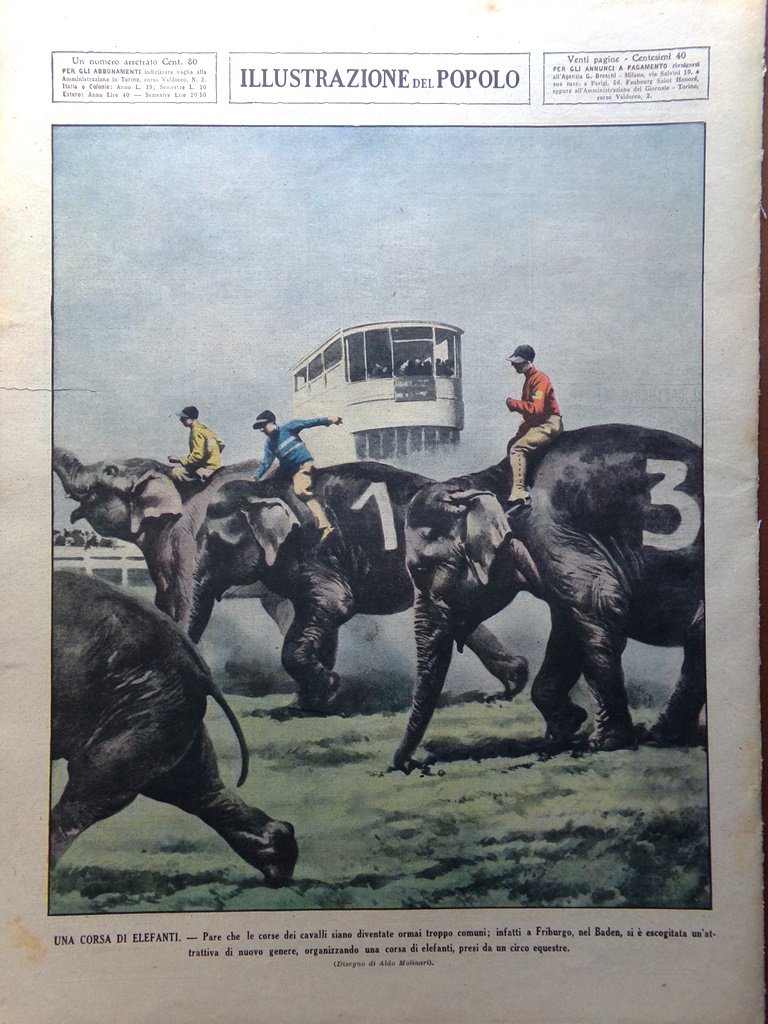 Pare che le corse dei cavalli siano diventate ormai troppo comuni; infatti a Friburgo, nel Baden, si è escogitata un'attrattiva di nuovo genere, organizzando una corsa di elefanti, presi da un circo equestre (Aldo Molinari)