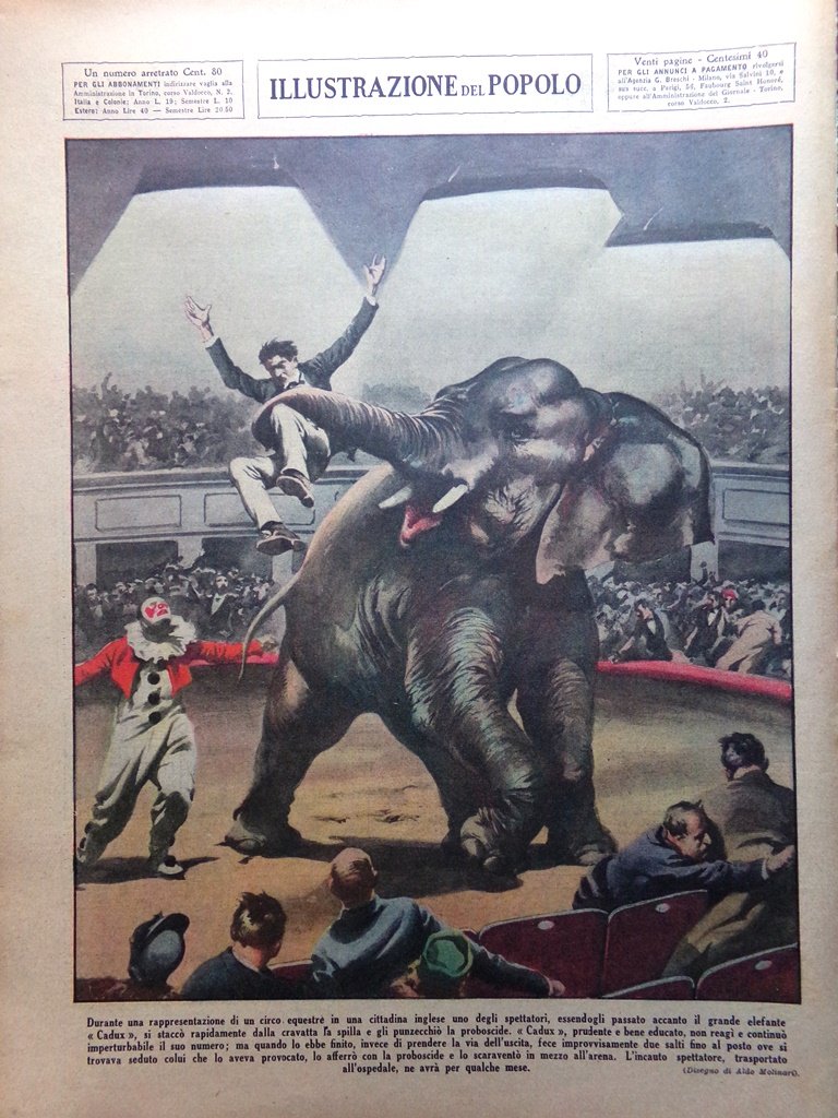 Durante una rappresentazione di un circo equestre in una cittadina inglese uno degli spettatori, essendogli passato accanto il grande elefante "Cadux" si staccò rapidamente dalla cravatta la spilla e gli punzecchiò la proboscide. "Cadux", prudente e bene educato, non reagì e continuò imperturbabile il suo numero; ma quando lo ebbe finito, invece di prendere la via dell'uscita, fece improvvisamente due salti fino al posto ove si trovava seduto colui che lo aveva provocato, lo afferrò con la proboscide e lo scaraventò in mezzo all'arena. L'incauto spettatore, trasportato all'ospedale, ne avrà per qualche mese (Aldo Molinari)