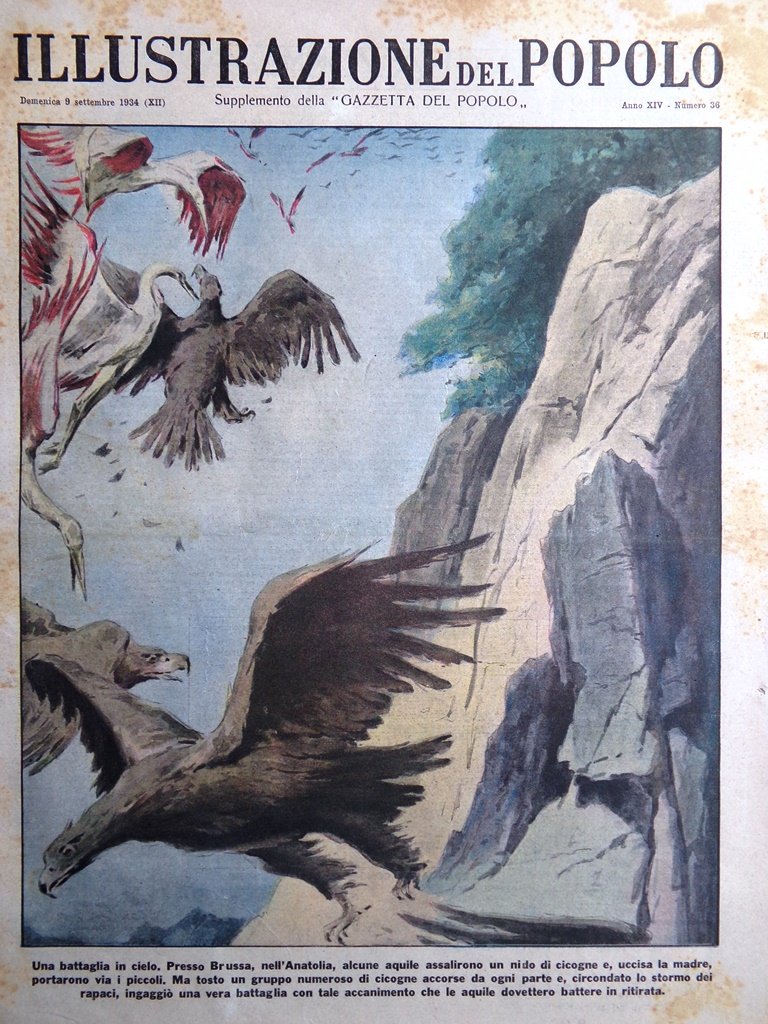 Una battaglia in cielo. Presso Brusa, nell'Anatolia, alcune aquile assalirono un nido di cicogne e, uccisa la madre, portarono via i piccoli. Ma tosto un gruppo numeroso di cicogne accorse da ogni parte e, circondato lo stormo dei rapaci, ingaggiò una vera battaglia con tale accanimento che le aquile dovettero battere in ritirata