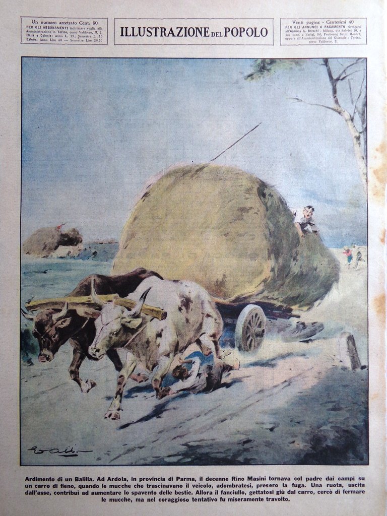 Ardimento di un Balilla. Ad Ardola, in provincia di Parma, il decenne Rino Masini tornava col padre dai campi su un carro di fieno, quando le mucche che trascinavano il veicolo, adombratesi, presero la fuga. Una ruota, uscita dall'asse contribuì ad aumentare lo spavento delle bestie. Allora il fanciullo, gettatosi giù dal carro, cercò di fermare le mucche, ma nel coraggioso tentativo fu miseramente travolto