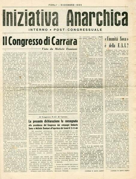 1 fasc., 6 p. ; 40 cm. Numero unico n. u. (Forlì, dic. 1965). Bollettino fuori commercio, la sua circolazione è limitata esclusivamente ai militanti anarchici. Redattore resp.: Emilio Frizzo. Il giornale di polemica politica venne stampato dopo il Congresso anarchico riunitosi a Carrara dal 31 ottobre al 5 novembre 1965, l'ottavo congresso nazionale, della Federazione anarchica italiana. In sede congressuale i dissidi relativi all'approvazione del nuovo Patto associativo provocarono una scissione e la conseguente nascita dei Gruppi di iniziativa anarchica (GIA). Un fascicolo di 6 pagine, testo su cinque colonne. Carta leggermente ingiallita, per il resto esemplare integro. Codice libreria 6888.
