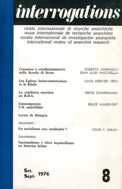 Interrogations n. 8 (set. 1976). Revue internationale de recherche anarchiste = rivista internazionale di ricerche anarchiche = revista internacional de investigacion anarquista = international review of anarchist research.