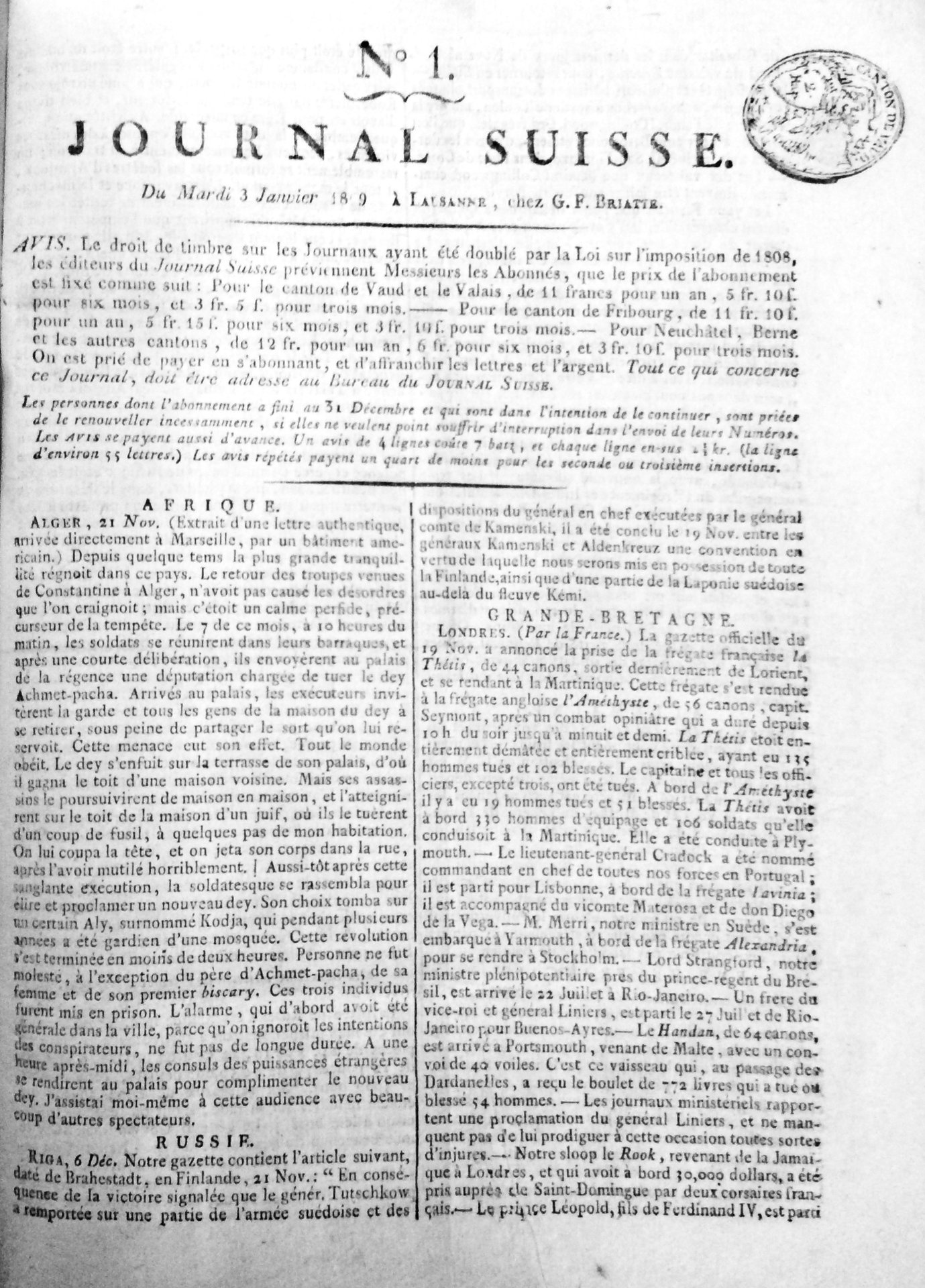 JOURNAL SUISSE - 1809. - Editore e redattore G.F. Briatt.
