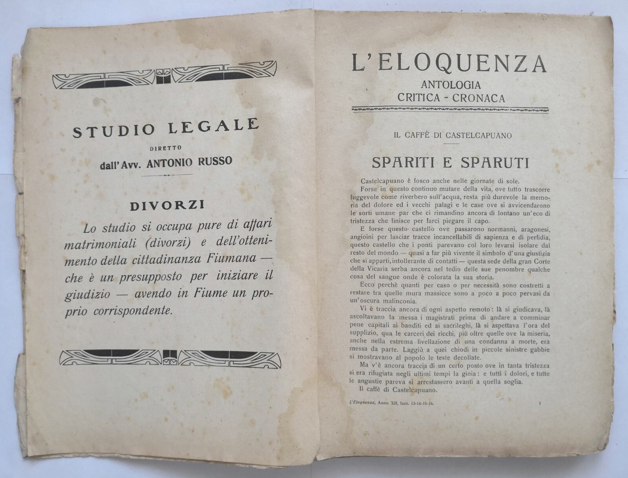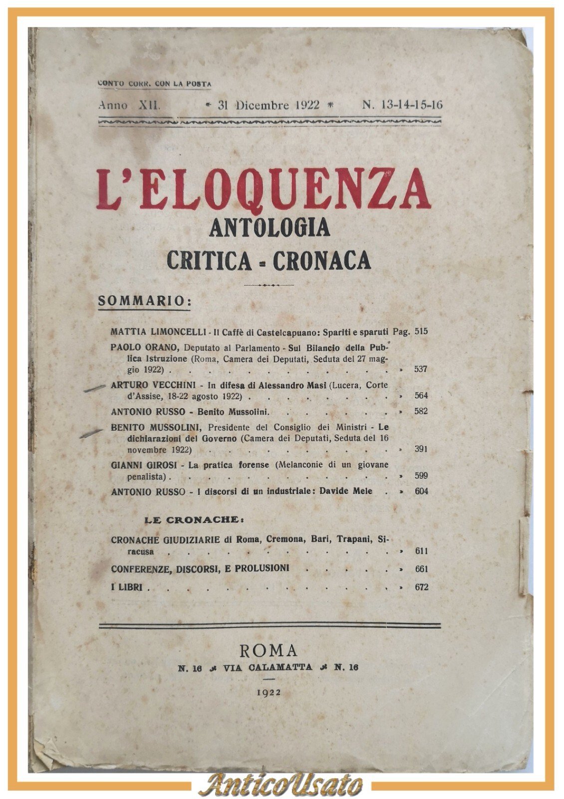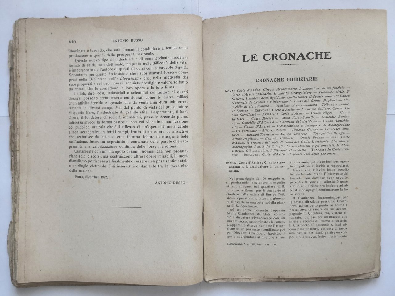 L'ELOQUENZA Numero 13 14 15 16 ANTOLOGIA CRITICA CRONACA 1922 rivista diritto