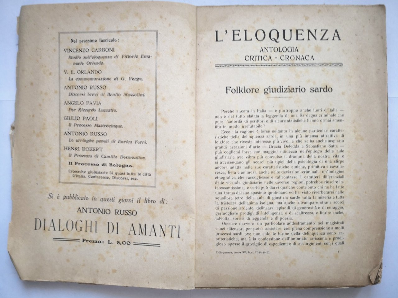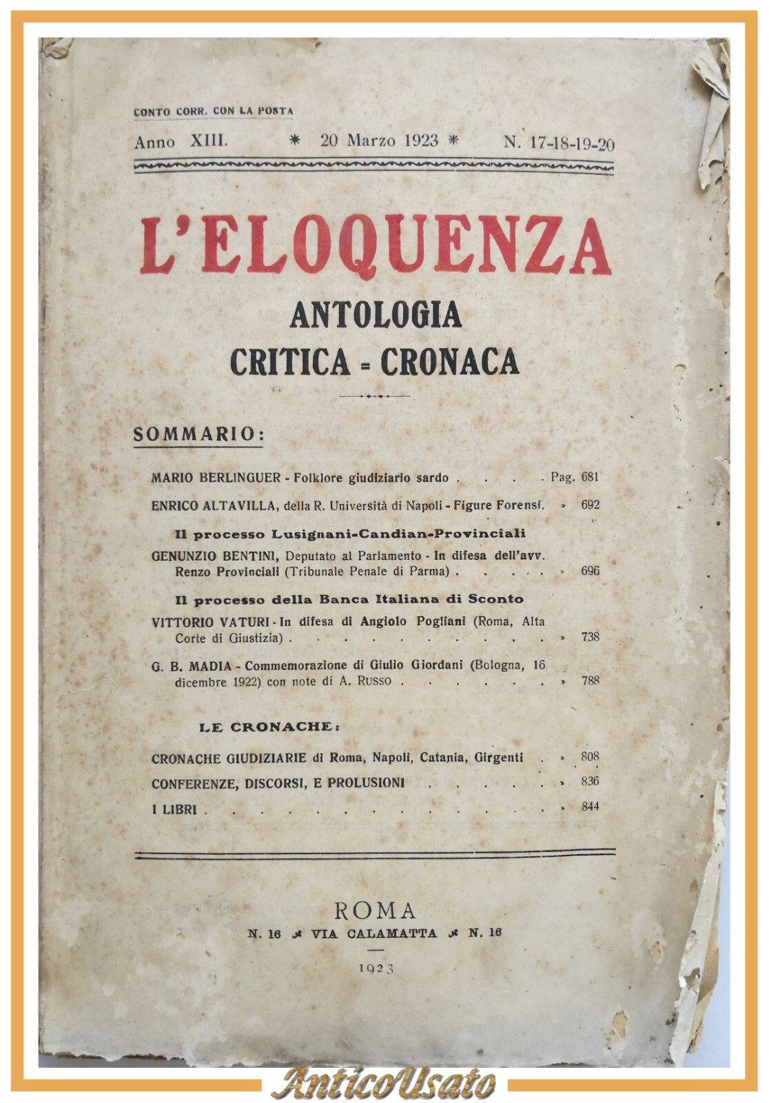 L'ELOQUENZA Numero 17 a 20 ANTOLOGIA CRITICA CRONACA marzo 1923 rivista diritto