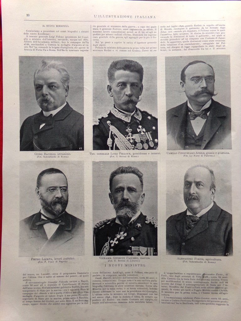 I nuovi ministri: Giuseppe Palumbo, Alessandro Fortis, Camillo Finocchiaro-Aprile, Luigi Pelloux, Pietro Lacava, Guido Baccelli