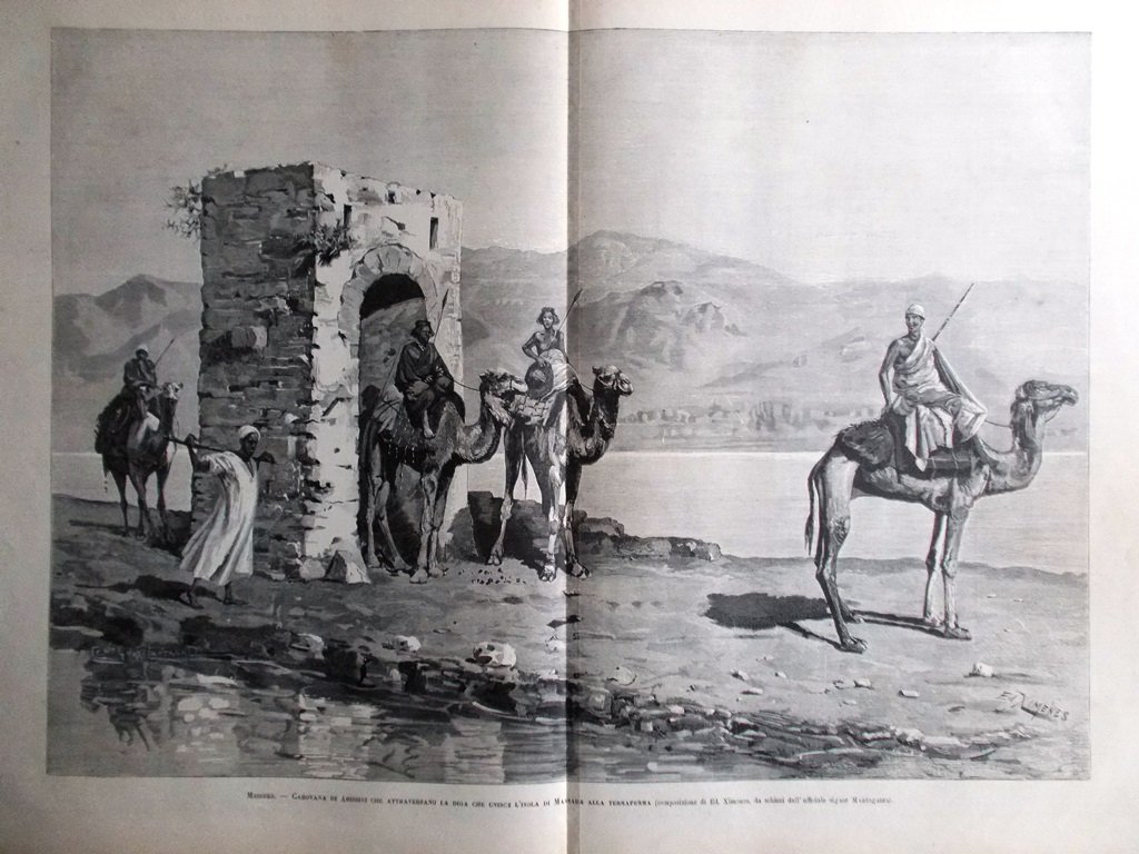 Massaua: carovana di abissini che attraversano la diga che unisce l'isola di Massaua alla terraferma (Stampa a 2 pagine)